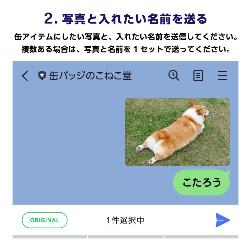 LINEからお持ちの写真をお送りいただくと、オリジナルの名入れ缶アイテムを作成できます。